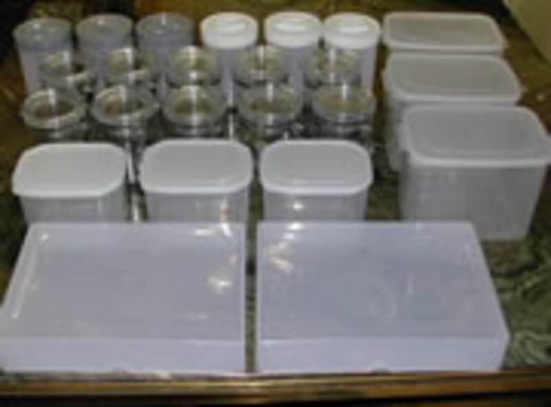 | 目の高さ3段分の食材をテーブルに広げてみると、その量に驚いてしまいます。また形状もばらばら・・・これでは使いづらいし整理しづらいのは当然です。 | ここへ登場するのが、ディスカウント価格のコンテナ類。これだけで総額2400円!!スケルトンなのでとても使いやすい。 | |