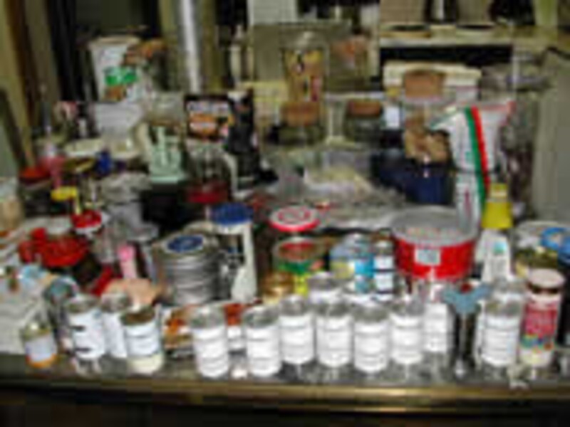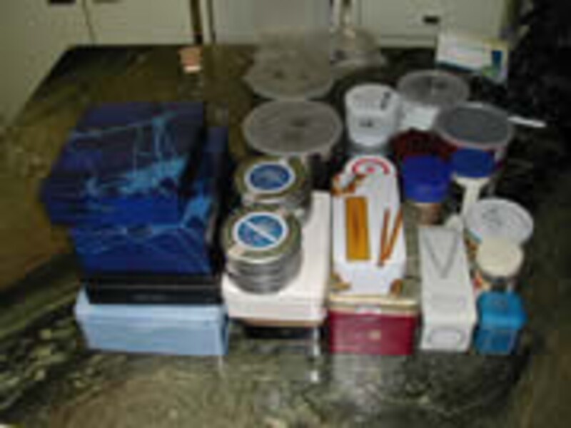 | 整理の終わった食品庫の三段分、煎餅の入っていた25センチ角の空き缶3個は、中身が見えないのでバツだけれど、小麦粉や砂糖と塩のコンテナとして重宝しているので、今回は処分見送り・・・。近日中にスケルトンのコンテナを見つけて再整理しようと思っている。 | 整理した結果出てきた空き缶の類。表書きをしていても、中身が見えないので使いづらい。 ちなみに我が家では、お米やもち米、麦などの穀類は2リットルのペットボトルに詰めている。虫も入らず湿気ない整理しやすいのでとても便利である。 |