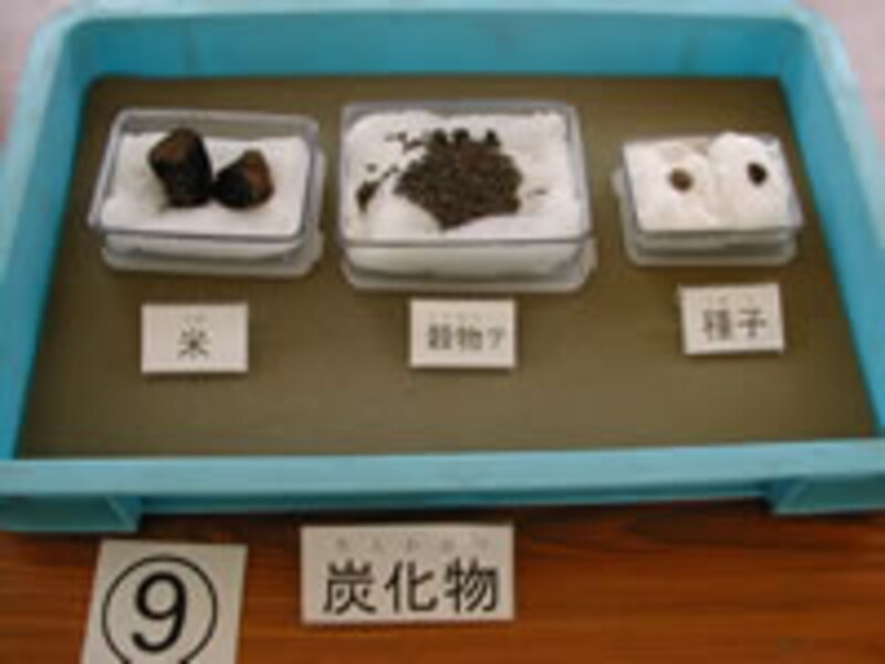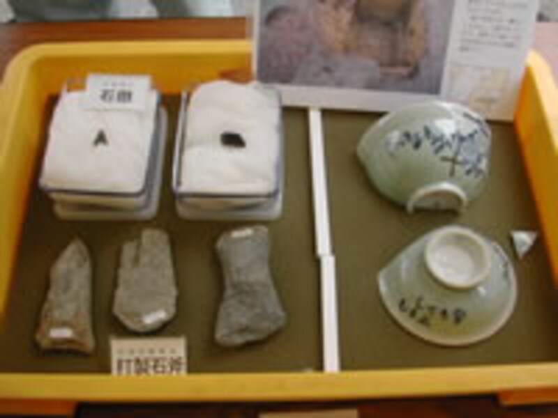 | 炭化物(米、穀物、種) | 石斧/防空壕から出土した茶わん(撃ちてし、止まむ・と記されている) | |