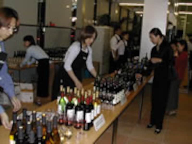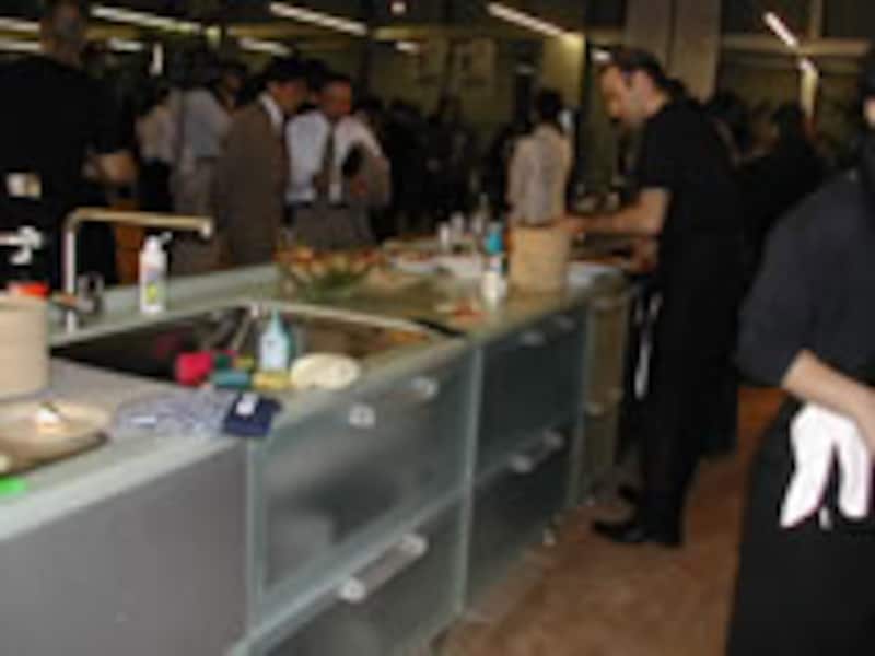 キッチンスタジオのオープンとあって、十数種類のワインや数々のカナッペやにぎり鮨など、 千人のゲストのお腹を充分にみたせてくれるメニューにみなさん満足顔!! |