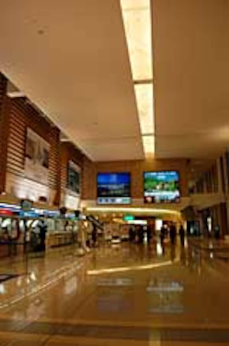 このような間接照明を随所に取り入れたターミナルビル内は明るく、全般に暖かな光が目立ち、乗客を歓迎するに相応しい空間になっていました。3階に送迎デッキがあるのですが、夜は滑走路の青や青緑の光を見ることができます。