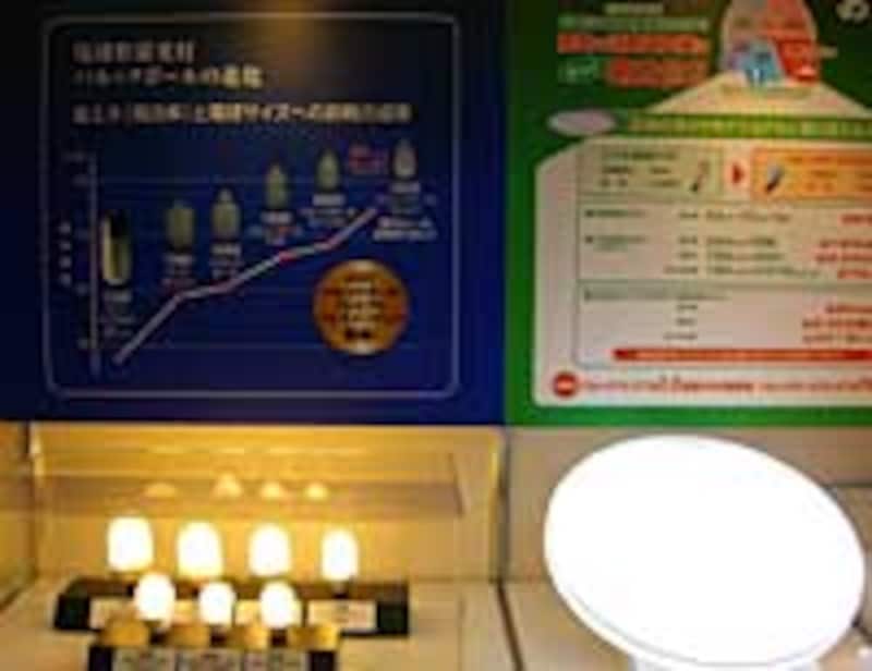新製品のご紹介写真1.パルックボールプレミアムの説明ボード先日発売されたナショナルのパルックボールプレミアムをご紹介します。どのタイプも定格寿命が10000時間になっています。10000時間というと、例えば一日6時間程度点灯する場合ではおおよそ4年半もつ計算になります。これを白熱電球と比較するとミニクリプトン電球(2000時間)では1年弱、白色塗装電球にいたっては(1000時間)では約半年、ダイクロイックミラー付きハロゲン電球100V(3000時間)では約1年半です。今までのEFA、EFGで6000時間、EFDで8000時間だったので、大幅にランプ寿命が伸びています。また、点滅回数も20000回から30000回に増えています。30000回といえば、一日10回点滅した場合でも計算上約8年4ヶ月はもつことになります。電力量では、60W形で10W(従来は12W)と省電力になっています。写真2.パルックボールプレミアムの説明ボード電球型蛍光灯は集合住宅の共用部分や、屋外の低ポール灯やブラケット器具などでもよく使われます。長時間点灯でき、ランプ交換の手間も減るので、管理面でも有効だと思います。今後ナショナルだけではなく、他の蛍光ランプメーカからも新製品が続々誕生してくると思われますので、アンテナを張ってそのときに価格や性能で一番よいものが選べるようにすると良いです。<関連記事>「照明節約術~電気代を節約する~」「調光すると省エネになるって本当?」「白熱電球を経済的に使う5か条」匿名で優良会社にリフォーム相談! ホームプロでリフォーム会社を探す前のページへ123※記事内容は執筆時点のものです。最新の内容をご確認ください。