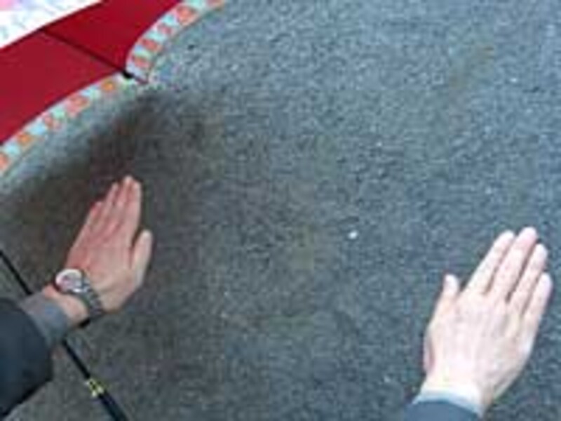 | 写真4.赤い傘の内と外での肌色の違い。 |