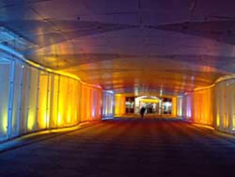 写真5はミュンヘン空港と繋がっているケンピンスキーホテルの地下通路です。パンティングメタルを透過するカラフルな光が、ホテルという非日常的な場所に向かう期待感を膨らませます。