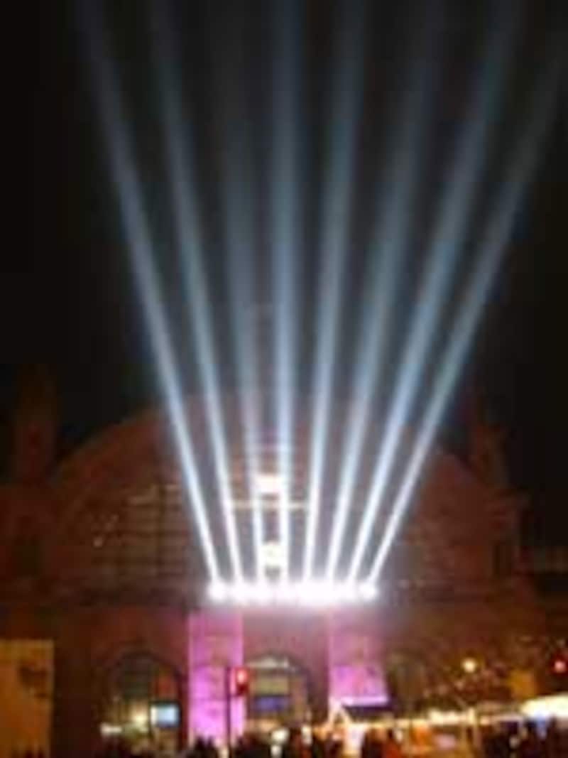 フランクフルト市内の会場は中央駅から歩いてまわれるぐらいの距離です。観光地としても有名なレーマ広場近くにもイベント会場が集まっています。伝統的なファサードをブルーの光でライトアップし、上部の装飾にはLEDと思われるオレンジ色の点光源を使用したライトアップは、地元の人も多く見に来ていました。(写真4)