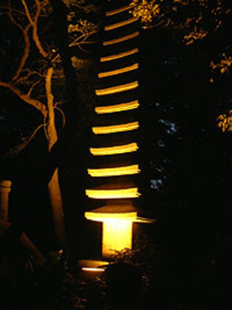 日本庭園内のベンチに腰掛けて暗くなるのを待つこと、およそ1時間。時報の合図と思われる音と同時に、ライトアップが始まりました。次第に闇が広がり、木々に隠れた辺りは光すら届くことなく、真っ暗です。