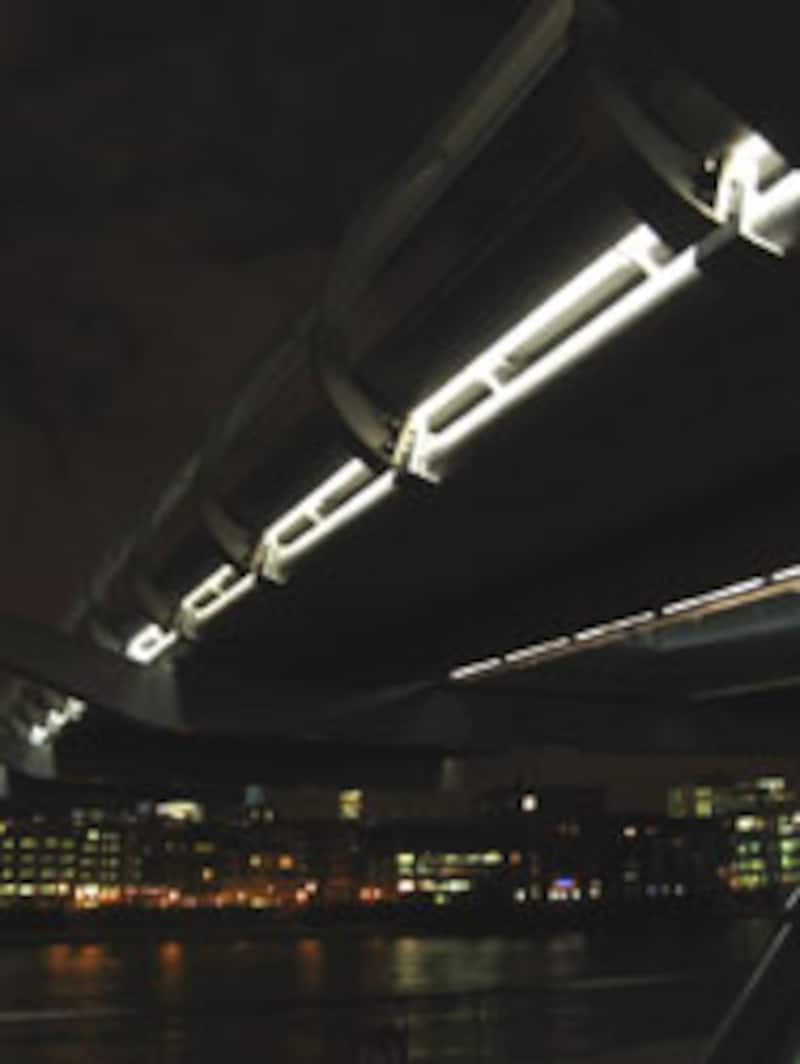 橋の高欄は、ガラス素材のために土木というより彫刻のような美しさです。昼間もいいのですが、夜はまた格別です。高欄と足元の連続した光の流れによって、浮遊する空間を歩いている気分になります。