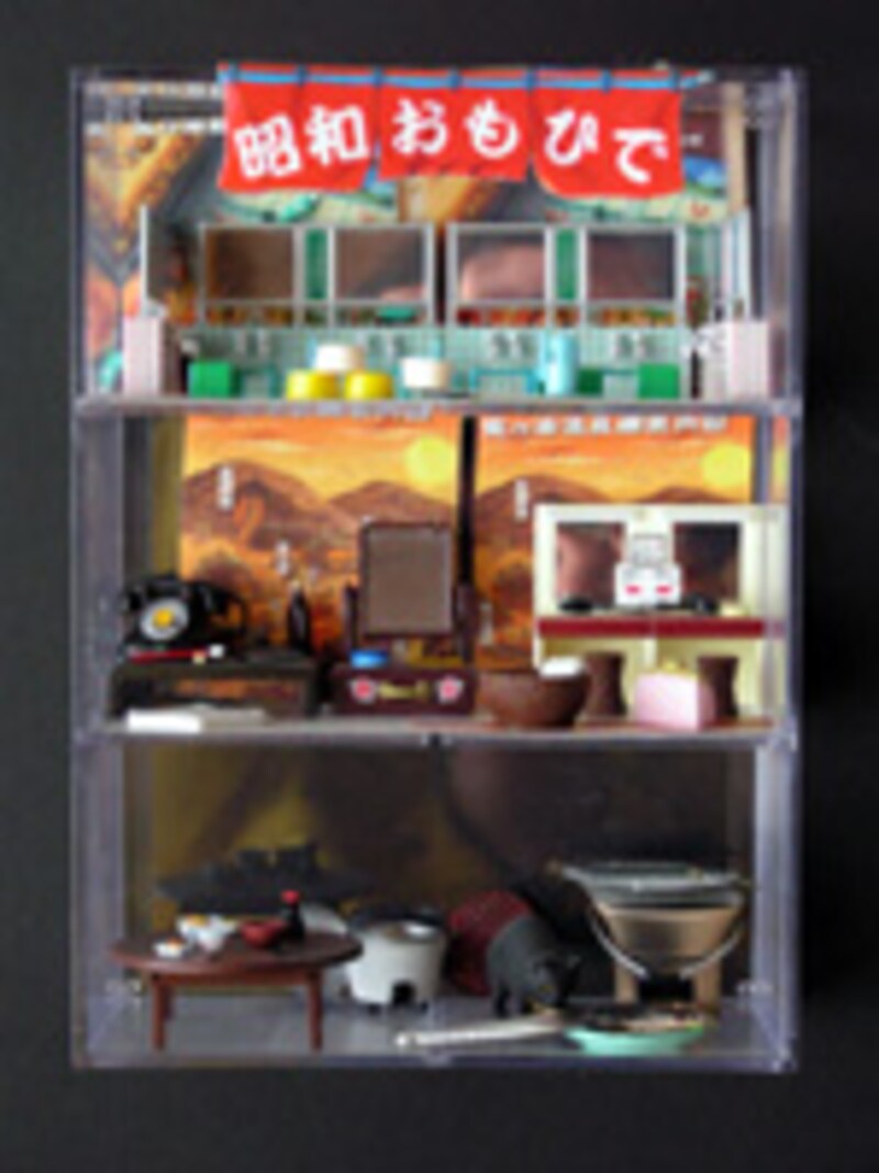 100円ショップで売られているクリアボックスを使い、そこに「昭和おもひで温泉・銭湯」と「タイムスリップグリコ」に付けられていた玩具を、接着剤や両面テープを使って貼り付けたもの。