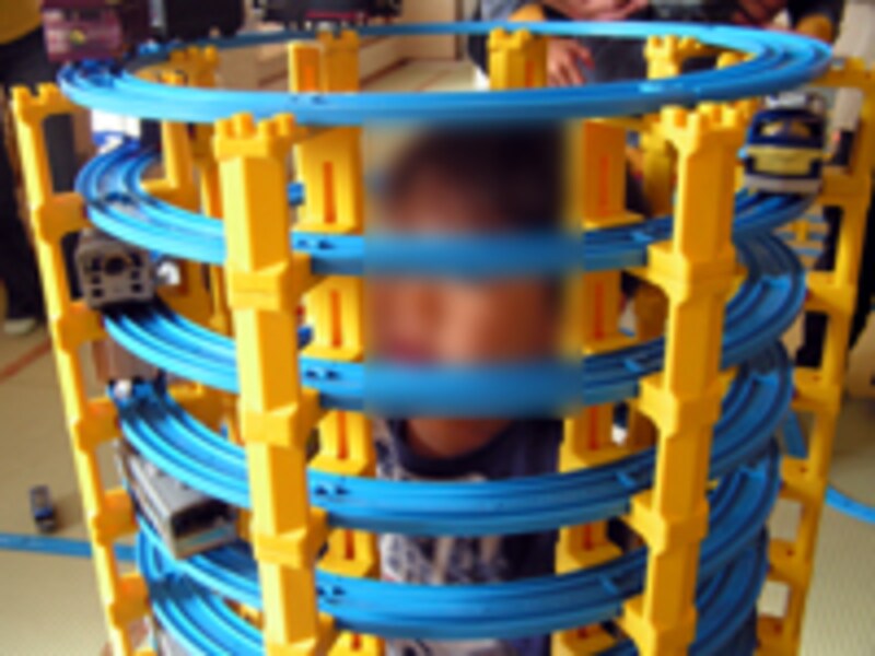 巨大なジオラマ作りもプラレールの大きな魅力の一つ。写真のように、”プラレールタワー”の中に入れば、子どもたち、もれなく大喜び!