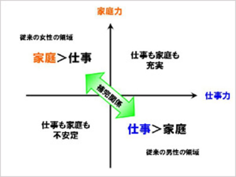 仕事を横軸、家庭を縦軸として4つの象限で考えると、右上と左下はあまり現実的ではありません。右下の「仕事>家庭」、左上の「家庭>仕事」というゾーンでいかに折り合いをつけるかということでしょう。