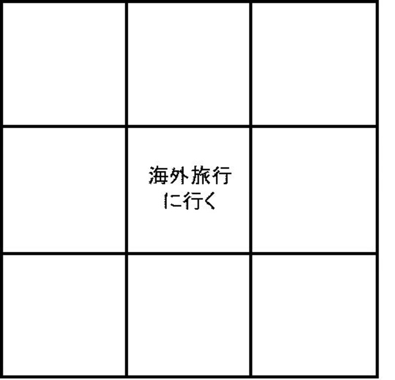 例えば、「海外旅行に行く」というのが挙がったとしましょう。今度はこの言葉を新しいマンダラートの中心に書いてみてください。中心のマスには「海外旅行に行く」。そして周辺の8つのマスは空白。>