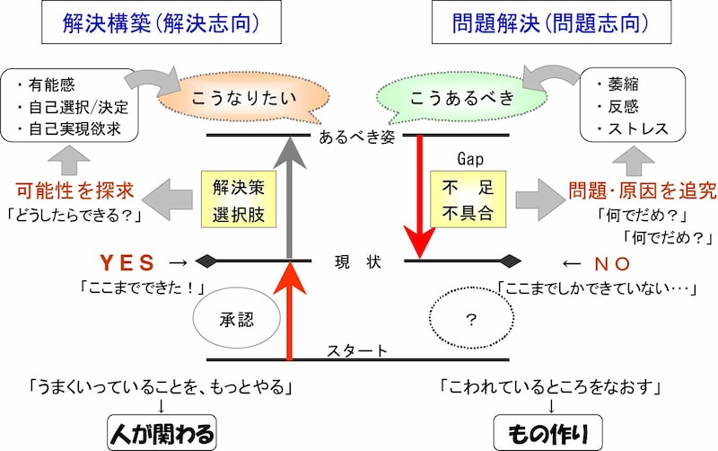 通常の問題解決アプローチでは、目標と現状の差に焦点が当たるので、現状に至るまでにやってきたことや、今うまくいっていることは忘れがちになります。これに対して、ソリューション・フォーカス(解決構築・解決志向)では、そこに焦点を当てて、承認していくのです。