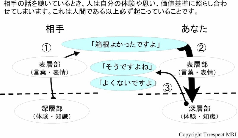 下の図をご覧ください。人と人がコミュニケーションするときの様子を、言葉と人が持つ体験・記憶との関係から描いたものです。