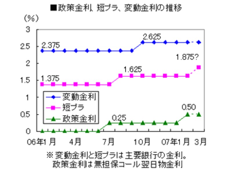 前回のゼロ金利解除のときも、短プラは翌8月に政策金利と同様に0.25%引き上げられました。今回も3月中に各銀行が短プラを引き上げると見込まれますが、貸出先への影響などを考慮して引き上げ幅を半分の0.125%とする可能性もあります。
