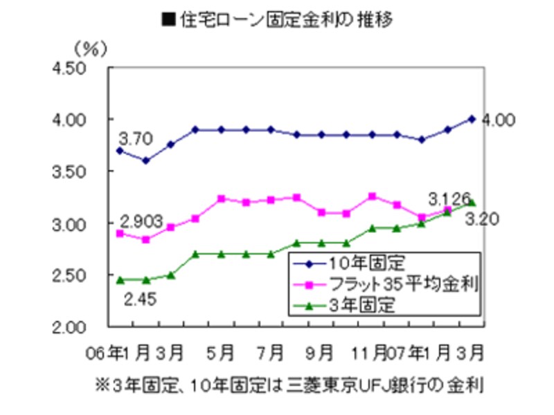 実際に、三菱東京UFJ銀行では3月の住宅ローン金利を引き上げると発表しました。アップするのは1年~20年の固定期間選択型すべてで、引き上げ幅は0.05%~0.1%。3年固定と10年固定はともに0.1%の引き上げです。全面的な金利引き上げは2カ月連続で、3年固定の店頭金利はフラット35の金利とほぼ変わらない水準となっています。