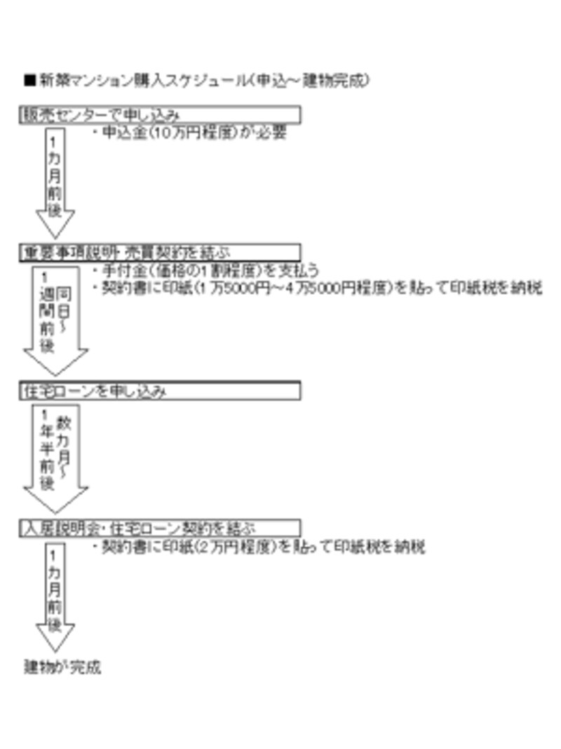 売買契約に続いて、金融機関に住宅ローンを申し込みます。新築マンションの場合は販売センターなどに購入者を集め、重要事項説明から契約、ローンの申し込みまでを1日で済ませるケースも多いようです。じっくりと内容を吟味している時間がないので、あらかじめ書類のコピーなどをもらっておき、家で熟読しておくことを強くお勧めします。なお、住宅ローンの申し込みでは特に費用は発生しません。ここから先の手続きは建物が完成する前後に行われます。まず入居が間近に迫った段階で「入居説明会」のお知らせが届くでしょう。説明会では入居までのスケジュールや登記手続きなどの説明があるほか、金融機関の担当者が来て住宅ローン契約(金銭消費貸借契約。略して「キンショー(ケイヤク)」などとも言う)を結ぶのが通常です。そのため、売買契約のときと同様、2万円程度の印紙税を支払います。