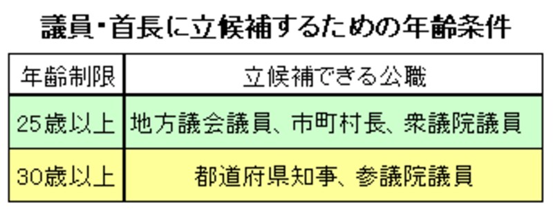 衆議院議員に立候補できるのは25歳以上ですから、太蔵議員が26歳で最年少というものもうなずけますね。このように、投票する権利(選挙権)の年令制限は20才以上ですが、立候補する権利(被選挙権)はこれより5歳または10歳高く設定されていますから、ここは要チェック!