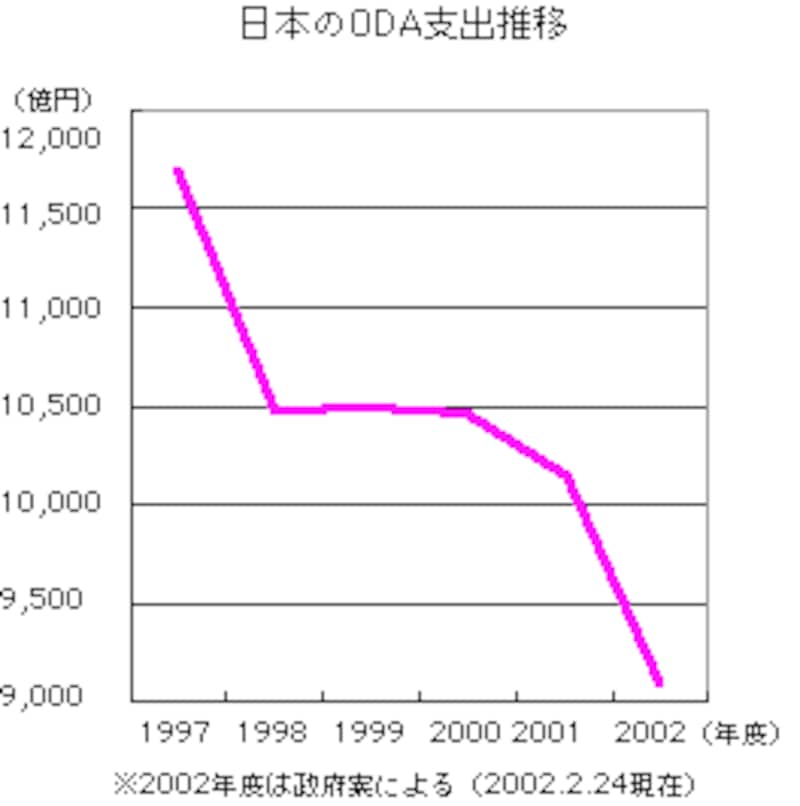 さて、こんなODAですが、小泉内閣は発足当初からODA予算の10%削減方針をかかげ、じっさい今年度の予算案ではODA予算が大幅にカットされています。