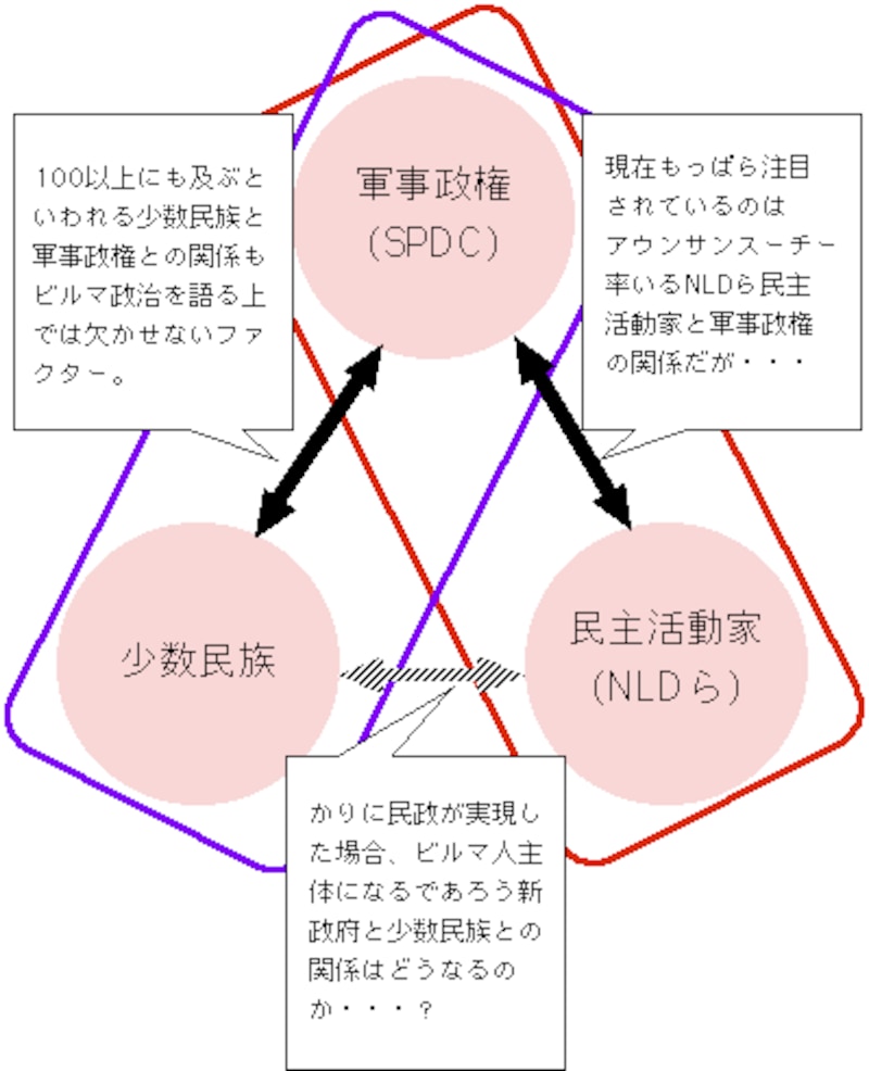 NLDら民主活動家らも基本的にはミャンマー(ビルマ)人主体。少数民族との連携を試みている勢力も一部にはありますが、それも「敵の敵は味方」的なものであって、かれらが政権を握ってからの少数民族への対応ははっきりしているわけではありません。