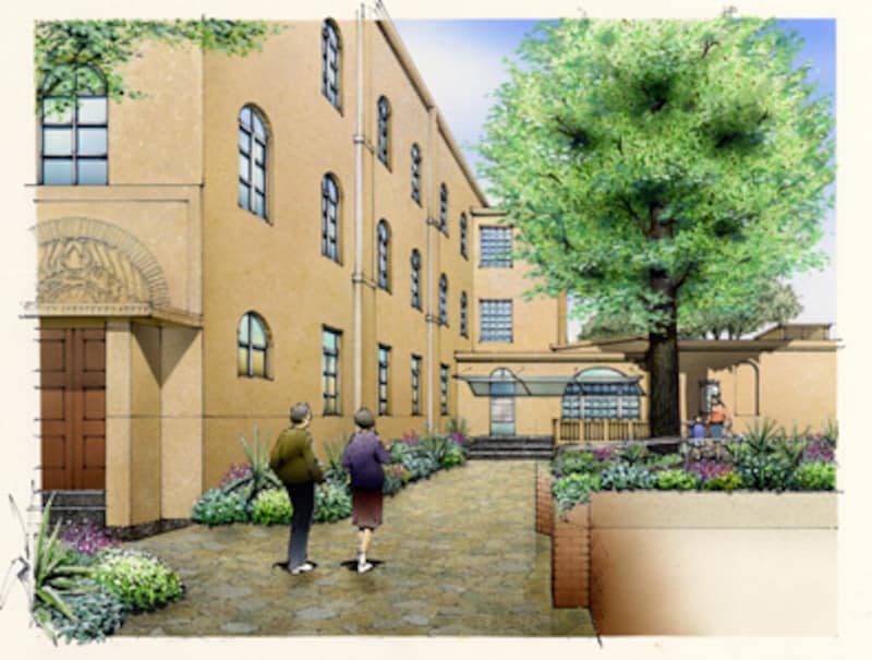 | リノベーション住宅の完成予想図。アール状の曲線を用いた窓など、現存の建物デザインをほぼそのまま生かした外観となる予定だ。 |