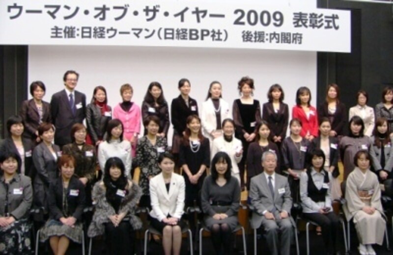 | 受賞者と審査員の皆さん。ちなみに受賞者は、各部門で10名ずつ受賞されています。内閣府特命担当(少子化対策、男女共同参画)小渕優子大臣も出席され、華やかな受賞式となりました |