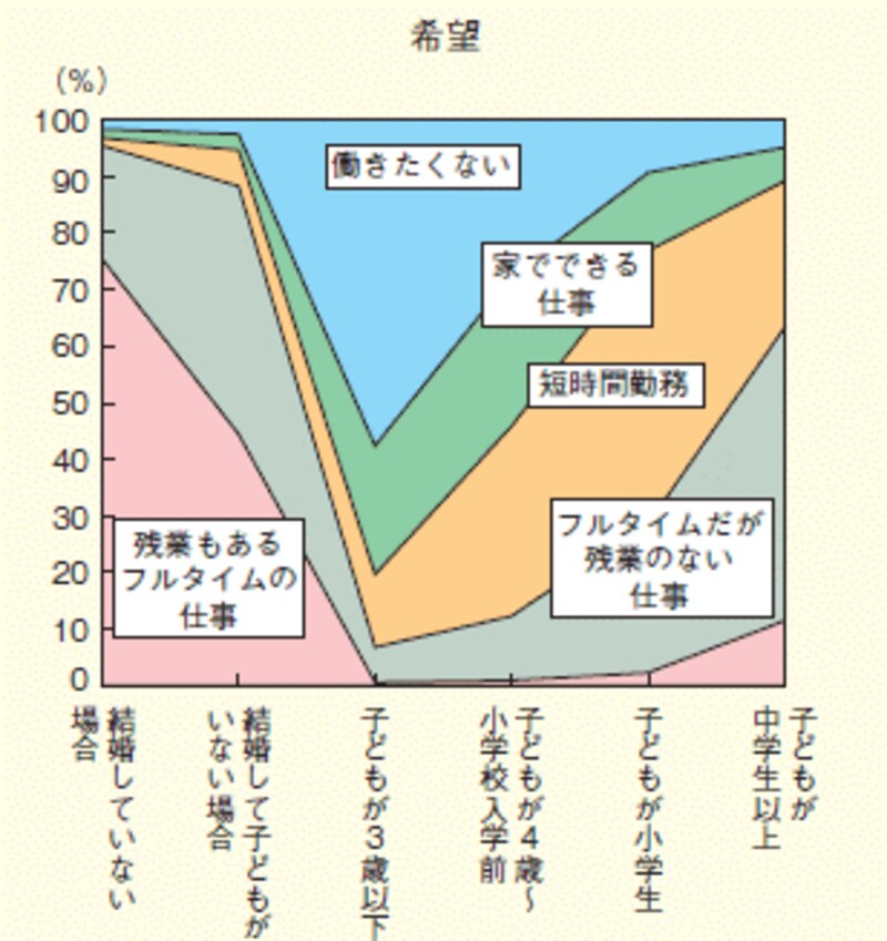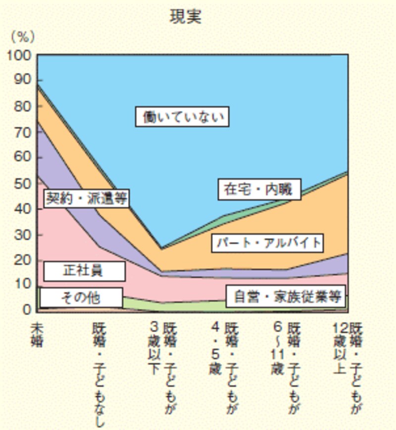 仕事を辞めて専業主婦になった後、子どもから手が離れてから仕事をしたいと希望する女性は多いにも関わらず、実現できていない人が多いのです。下記の「平成21年度版 男女共同参画白書」のデータでも、現実と希望のギャップがはっきりと出ています。【理想】