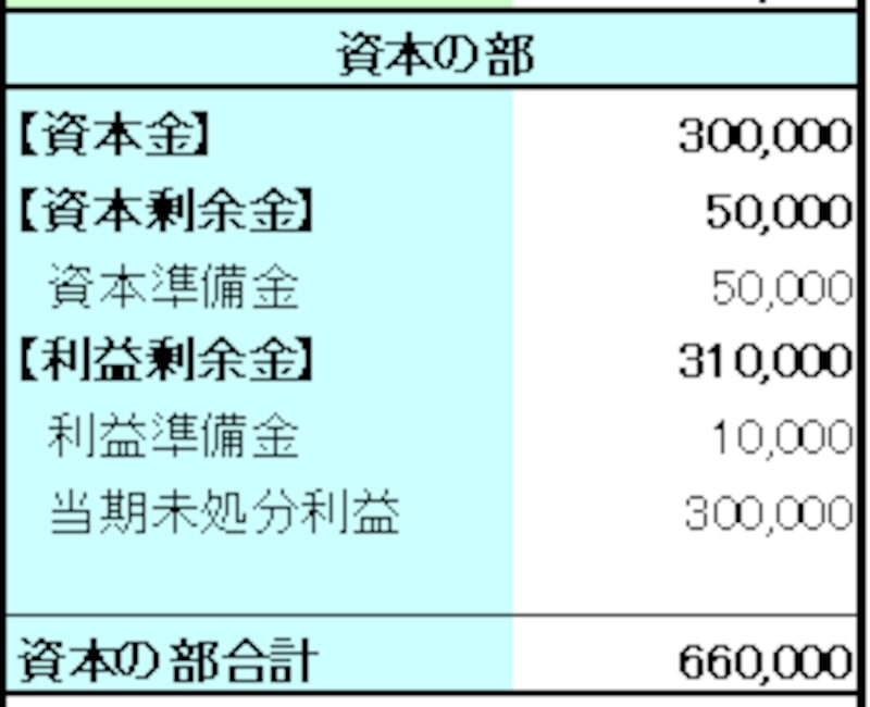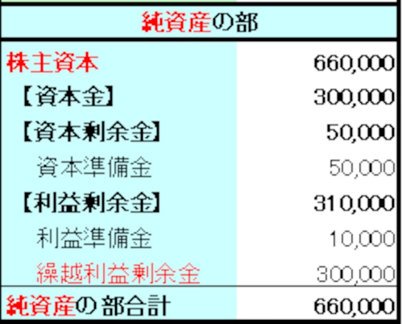 株主資本以外の項目は、「評価・換算差額等」「新株予約権」等を設けて表示しますが、この例のように、株主資本の項目しかない場合は、項目を設ける必要はありません。