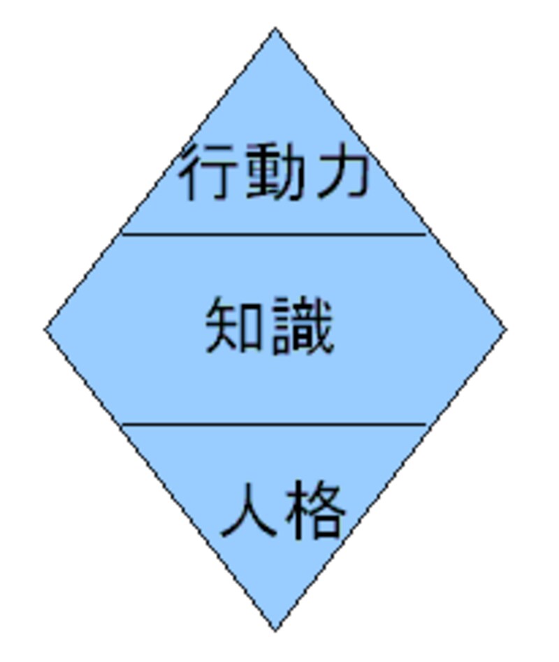 つまり、ビジネスパーソンは人格、知識、行動力という3角形をした資質を兼ね備えて初めて素晴らしい成果を上げることができるというわけです。