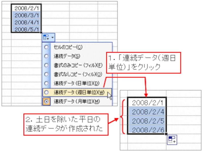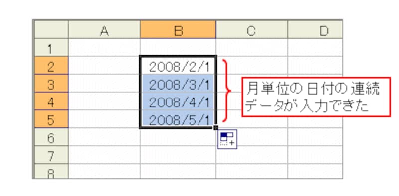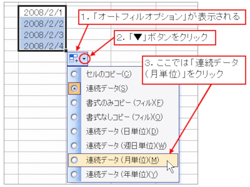 すると「オートフィルオプション」(スマートタグの一種)が右下に表示されるので、「▼」ボタンをクリックして表示されるメニューから、どの単位で日付データを加算するのかを指定します。ここでは「連続データ(月単位)」を選択してみましょう。