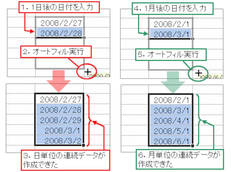 2つ目のセルに1日後の日付を入力すれば、日単位で加算された日付データが作成されます。もちろん、月をまたいだ日付データもキチンと計算されますし、うるう年も計算されます。同様に、1月後や1年後の日付データを入力してオートフィルを実行すると、月単位や年単位で加算された日付データを作成できます。