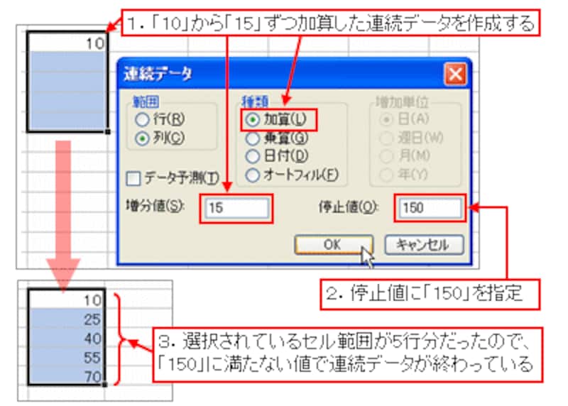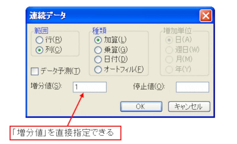左ボタンのオートフィルでは、2つ(またはそれ以上)のセルにデータを入力して、その差分から次のデータを「予測」して計算していましたが、このダイアログボックスでは、連続データを計算するときに加算する「増分値」を直接指定できます。