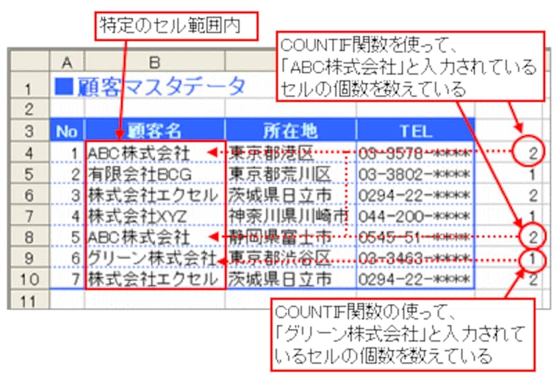 COUNTIF関数は「特定のセル範囲内で、あるデータが入力されているセルの個数を数える」関数。まさに、データの出現回数を数えたい重複データチェックで利用できる関数ですね。