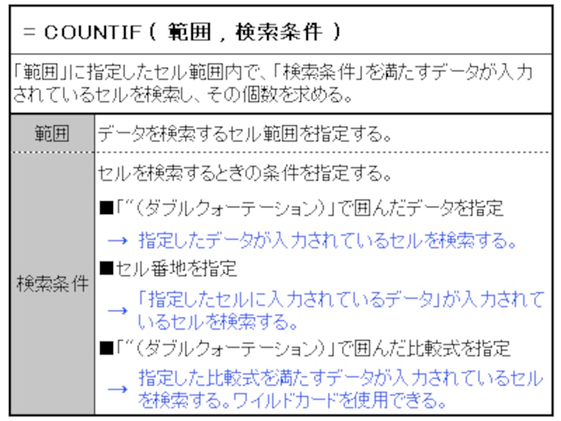 | ※今回の組み合わせ術とは直接関係ありませんが、COUNTIF関数の引数「検索条件」の指定方法を工夫すると、様々な活用法が考えられます。 |
