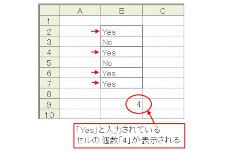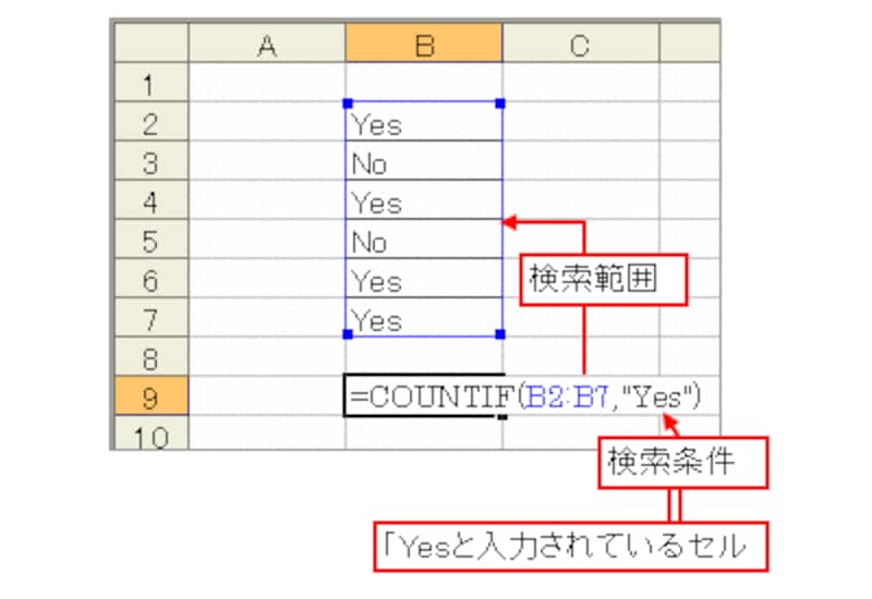 例えば、セルB2~B7に、次のように「Yes」と「No」が入力されています。ここで、セルB9に「=COUNTIF(B2:B7,"Yes")」と入力します。検索範囲に「セルB2~B7」を指定し、検索条件に「"Yes"」、つまり「『Yes』と入力されているセル」を指定します。![]() |