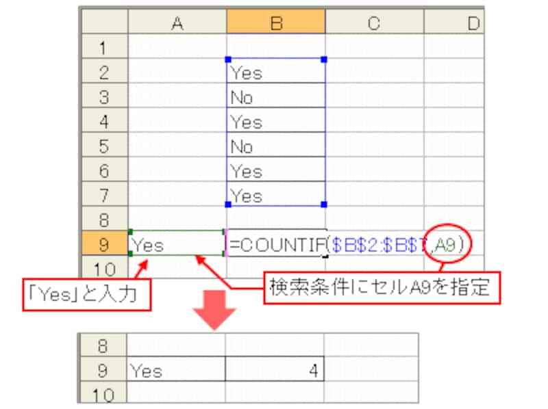 そこで、今度は、セルA9に「Yes」と入力して、検索条件にセルA9を指定します。これなら、何のデータの個数を求めているかわかりやすくなります。