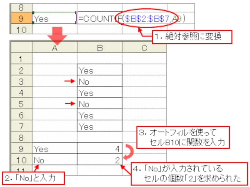 また、範囲に指定したセル範囲を絶対参照に変換すれば、セルA10に「No」と入力し、オートフィルを使ってセルB10に関数を入力すれば、簡単に「No」が入力されているセルの個数「2」を求めることができます。