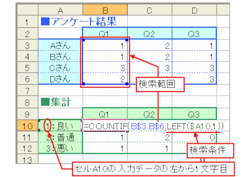 セルB10には、セル範囲B3~B6を検索範囲とし、「セルA10の入力データの左から1文字目」の文字列が入力されているセルの個数を求める数式「=COUNTIF(B$3:B$6,LEFT($A10,1))」が入力されています。
