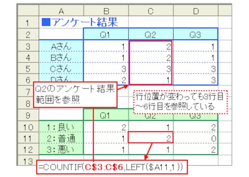 ここでは、複合参照を利用してセル範囲を記述しているので、集計結果を表示したいその他のセルにオートフィルで数式を入力できます。COUNTIF関数の「範囲」に指定した「B$3:B$6」は「3行目~6行目」の指定だけが固定されているので、C11のセルであれば、オートフィルにより「C$3:C$6」となり、Q2のアンケート結果範囲が参照されます。