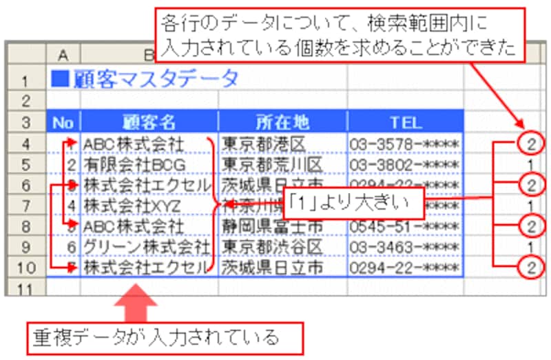 この数式を各行にコピーすれば、各行のデータについて、検索範囲内に入力されている個数を求めることができます。この個数が「1」より大きい行に、重複データが入力されている、ということになるわけですね。