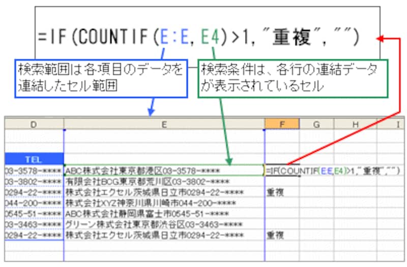 この連結した文字列のセル範囲をCOUNTIF関数の範囲に指定し、連結した文字列を検索条件としてCOUNTIF関数を作成すれば、全項目についての重複チェックがまとめて処理できます。