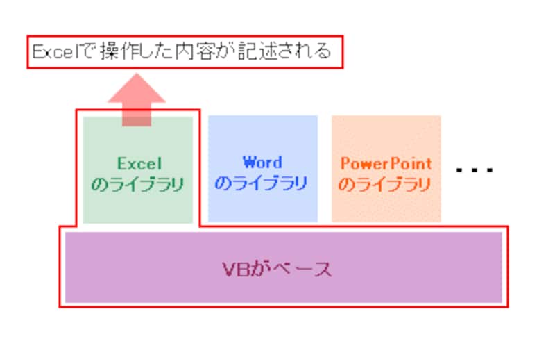 VBAはExcelに付属しているプログラム言語です。こう紹介すると、Excelのおまけ的な印象があるかもしれませんね。しかし!VBAは、今でもプログラム開発現場で活躍しているプログラム言語「Visual Basic(以下、VB)」とほぼ同等な機能を持っています。つまり、VBAは、本格的なプログラムを作成する実力を持ったプログラム言語なのです。ちなみに、Excelの操作を記録するVBAを「ExcelVBA」と呼びます。そして、WordやPowerPointなどのOffice製品にもマクロ機能が搭載されていて、その裏側で「WordVBA」や「PowerPointVBA」が活躍しています。もう少し正確にいうと、ベースにVBがあって、ExcelやWord、PowerPointなどを操作するための「ライブラリ」と呼ばれる部品が用意されており、それぞれのライブラリを使ったプログラムがVBのルールに則って記述される、というイメージです。