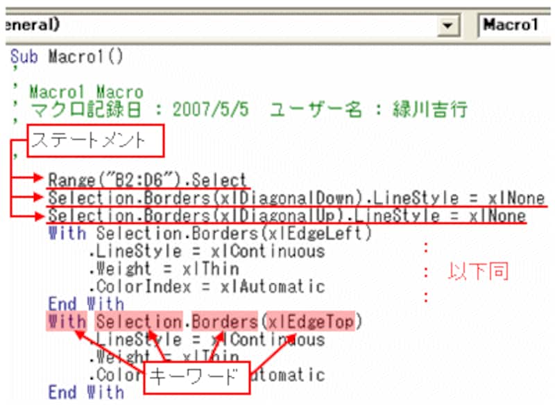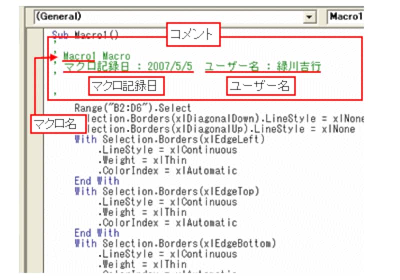 「'」から始まる緑色の部分は「コメント」と呼ばれ、プログラムの実行に関与しません。主にプログラムに関する覚え書きやメモを記述します。マクロ記録では、自動的に「マクロ名」「マクロ記録日」「ユーザー名」がコメントで作成されます。|  |