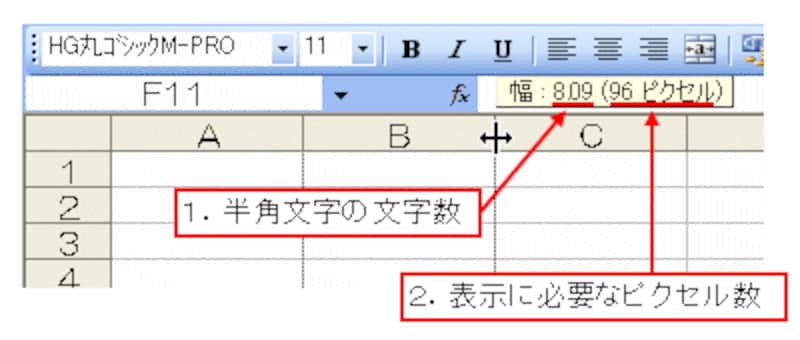 つまり、列幅を表す単位は「表示できる文字数」である、ということです。なお、MS Pゴシックなどのような、文字によって文字幅が異なる「プロポーショナルフォント」の場合は、半角文字「0」の文字幅を基準とします。