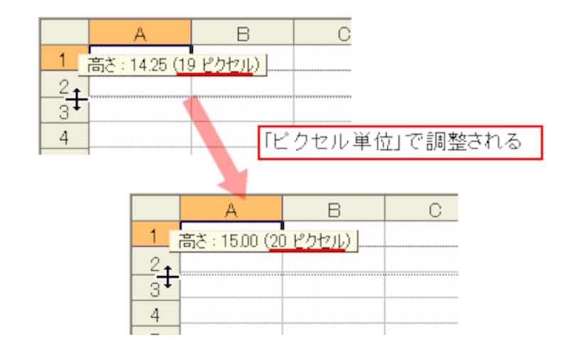 なお、マウスでセルの高さを調整する場合、ディスプレイで表示できる最小単位がピクセルであるため「ピクセル単位」で調整されます。