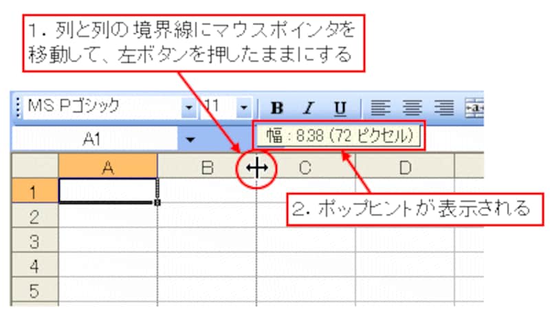 セルの高さと同様に、列幅の数値を表示してみましょう。列幅の数値を表示するには、列と列の境界線にマウスポインタを移動して、ポインタの形が変わったところで左ボタンを押したままにします。すると、次のようなポップヒントが表示されます。![]() |