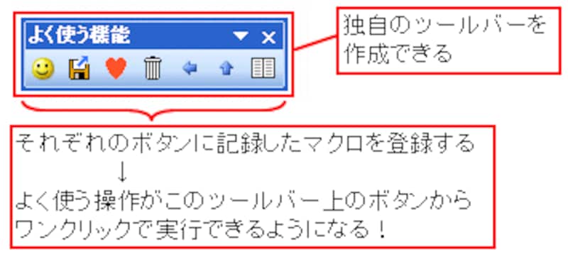 さらに、マクロを登録した複数のボタンを並べて、独自のツールバーを作成することもできます。頻繁に行う操作をいくつか記録し、それぞれのマクロをボタンに登録してツールバーにまとめておけば、作業効率アップ間違いなしです!