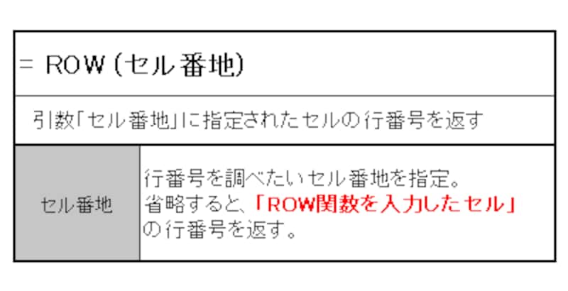 ROW関数は、セルの「行番号」を返す関数です。構文は次の通りです。![]() |