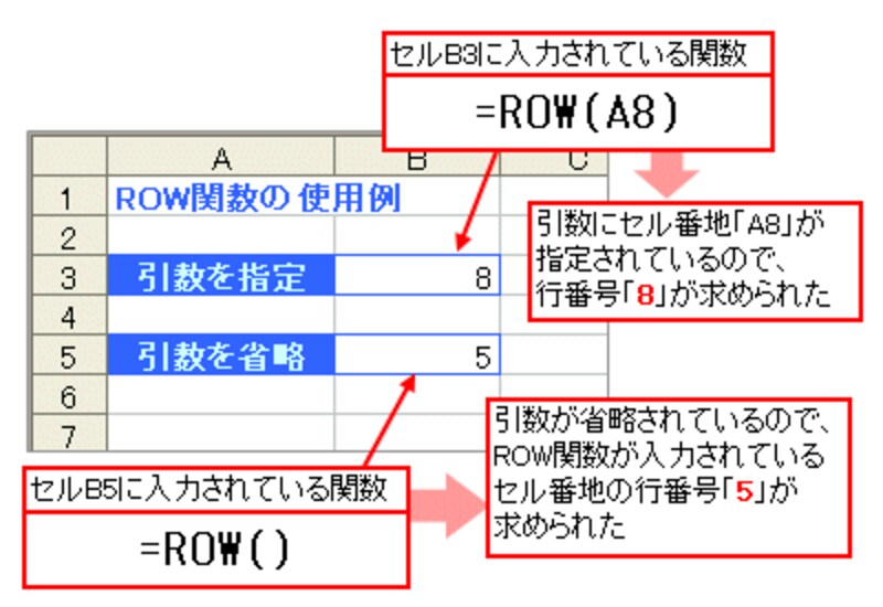 たとえば、引数に「A8」と指定すると「8」を返すわけですが、この関数は、「引数を省略したとき」に「ROW関数が入力されているセルの行番号」を返す点が大きなポイントです。