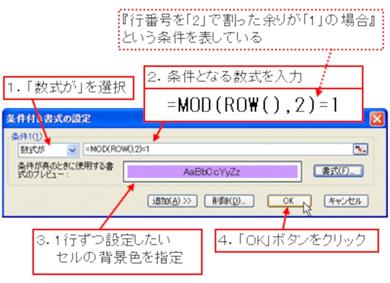 表示された「条件付き書式の設定」ダイアログボックスで、下図のように設定します。入力する数式が「セルの行番号が奇数の場合」という条件を表していますね。この条件を満たすときだけ、セルの背景色を設定するようにすれば良いわけです。設定したら、「OK」ボタンをクリックします。