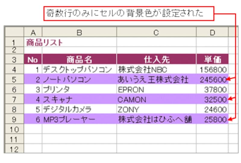 1行おき(奇数行のみ)にセルの背景色が設定されました。
